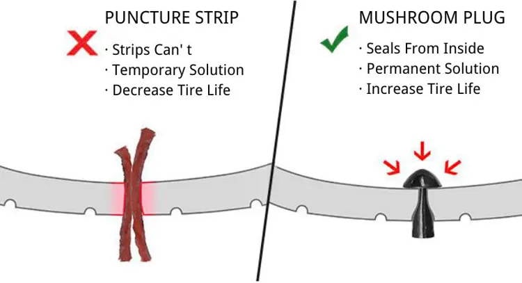 Mushroom-shaped plugs provide the ultimate solution to all tubeless tire punctures. The mushroom plugs are made of a unique combination of rubber that does not wear out with time compared to conventional puncture strips.